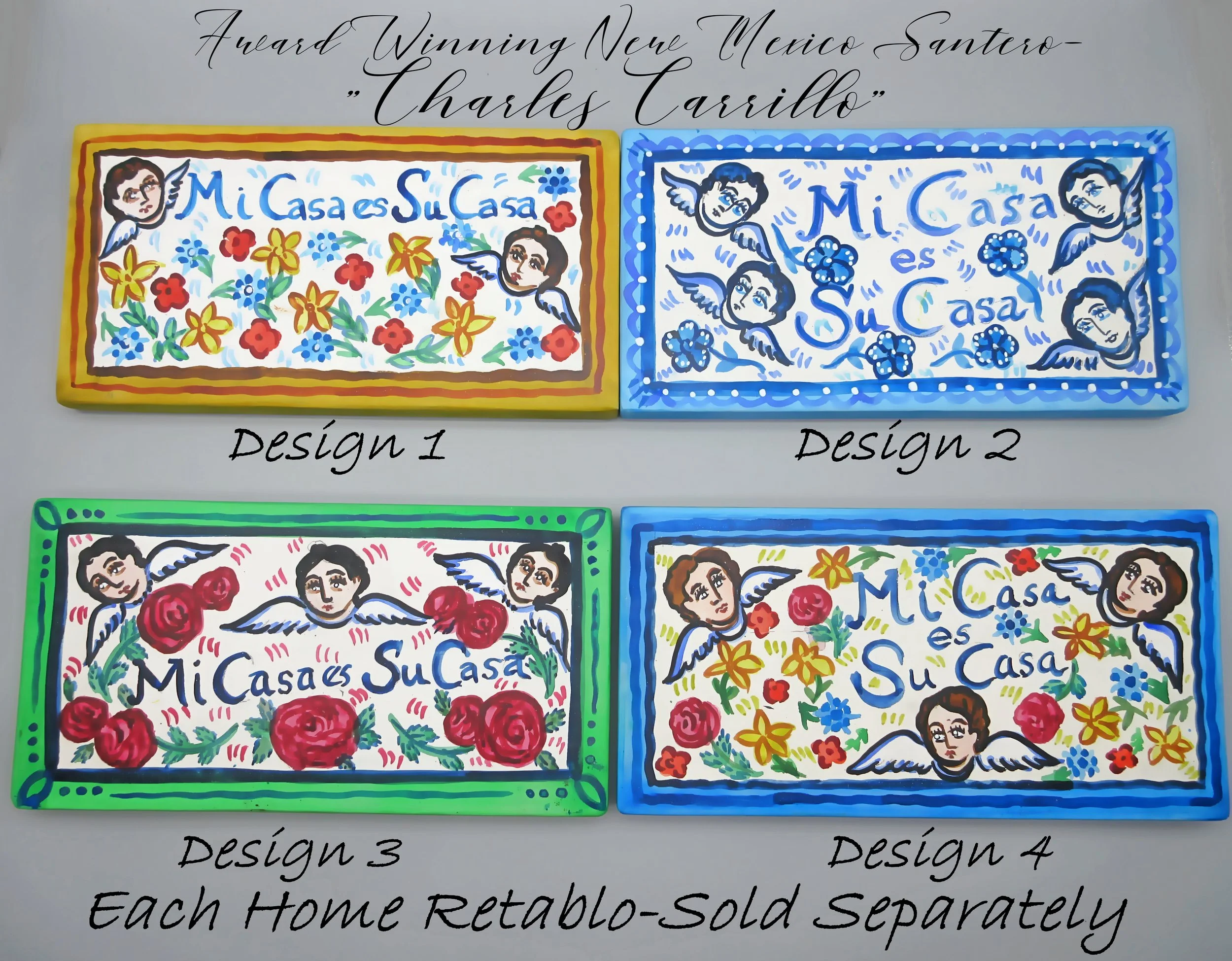 Love the look of Santa Fe?? Love the traditional art of New Mexico? Well, no home or door is complete without a âMi Casa es Su Casaâ retablo! Made exclusively for us by multi award winning Santero, Charles Carrillo, who is the âreal dealâ and not only a true favorite here in New Mexico, but world wide. Each are traditionally made with all natural pigments that are painted on New Mexico Ponderosa Pine that Charlie cut & shaped himself! Each are sold separately.